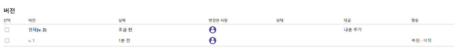 다음으로 [버전 이력]으로 들어가 버전 이력을 남기지 않은 버전을 삭제합니다.(관리자 계정으로만 가능)