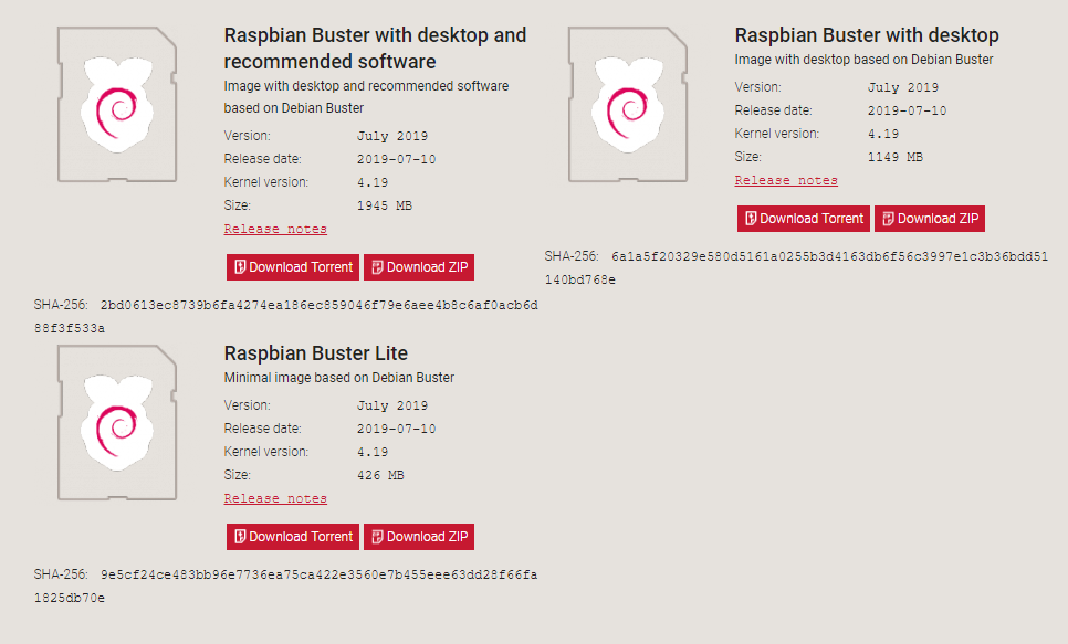 Raspbian 다운로드 링크로 들어가서 Raspbian Buster with desktop를 선택한다. Torrent를 사용한다면 Torrent를 이용하는게 훨씬 빠르다.