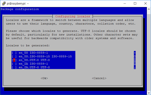 Change Locale 항목을 선택하고 들어가면 여러 언어의 옵션이 있는데 키보드의 방향키를 이용해서 en_GB, UTF-8 UTF-8, en_US.UTF-8 UTF-8을 스페이스바를 눌러서 선택해준다.