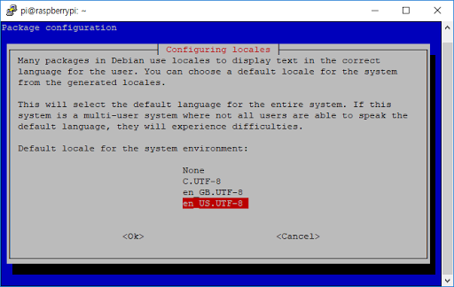 엔터를 누르게 되면 기본 언어를 설정하는 창이 뜨게 된다. 여기서 en_US.UTF-8 UTF-8을 기본 언어로 선택하면 된다.