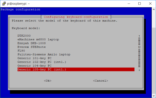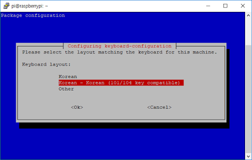 Generic 105-key PC (intl.)을 선택하고 엔터를 눌러준다. 그리고 Korean - Korean (101/104 key compatible)을 선택한 후 마지막으로 No compose key를 선택한 후 엔터를 누르면 된다.